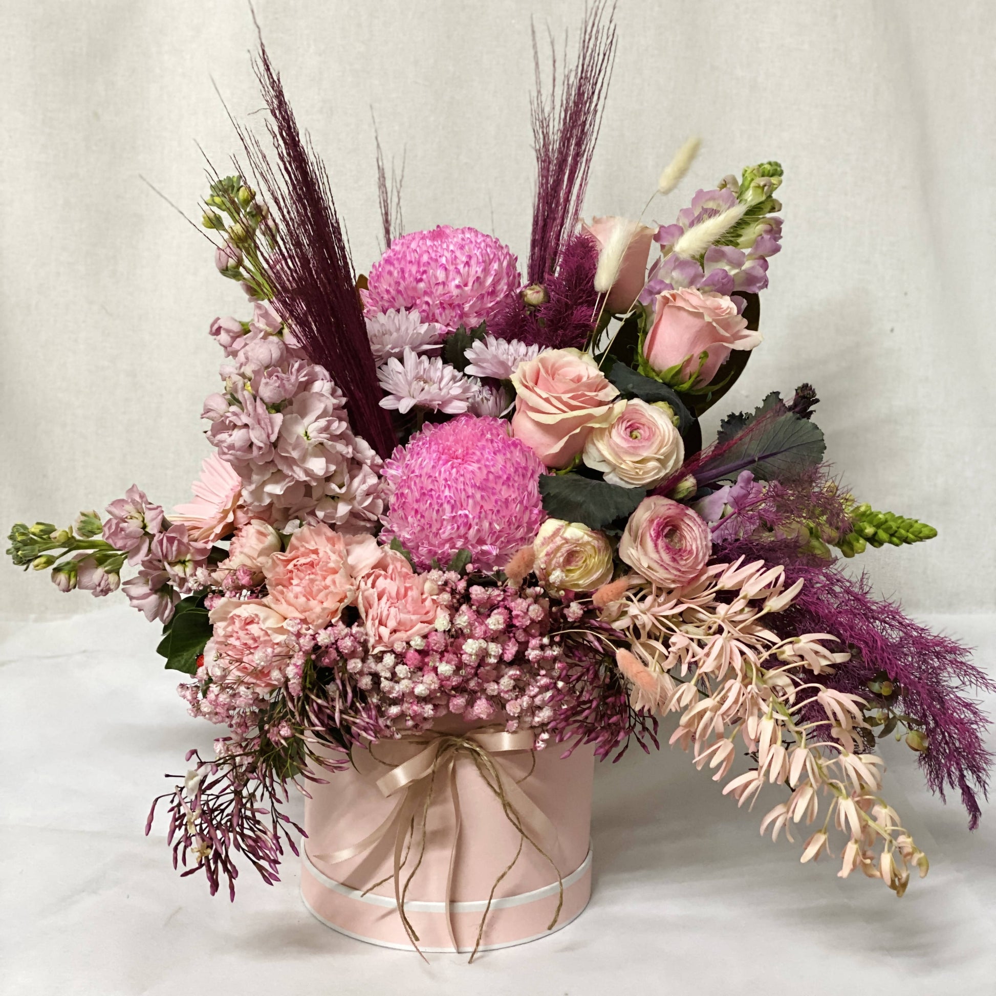 A large hat box arrangement with the freshest seasonal pink and blush blooms with preserved flower accents.